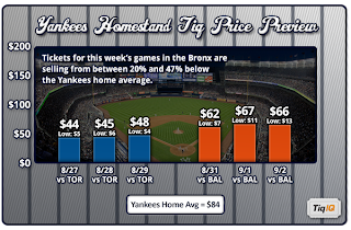 Don't forget: deals from ScoreBIG can be had for 25-50% off their list prices for all games on the homestand. These deals are located in all available TiqZones. All you need to do is click on the ScoreBIG link provided above, sign up if you have not done so already, find the section you would like to sit in and make an offer based on the savings shown here. And as usual you won't have any annoying service or shipping fees to worry about! Just click here for ScoreBIG deals https://www.scorebig.com/p/new-york-yankees-tickets